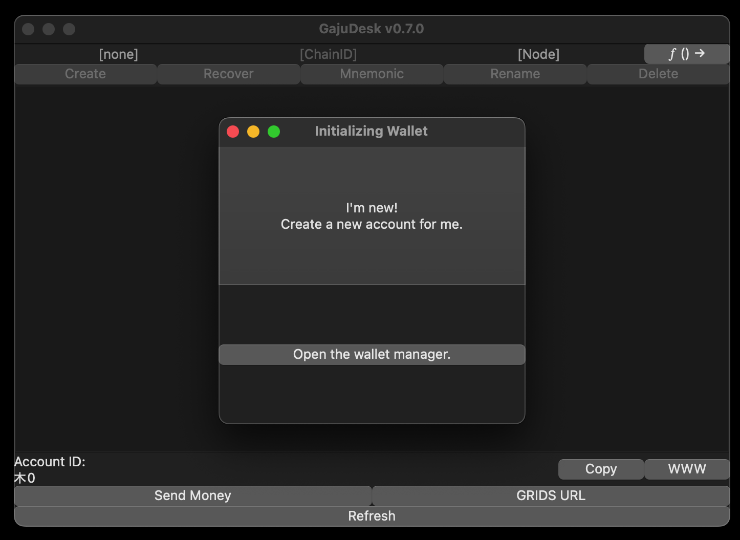 The first time GajuDesk is run it will offer to create a new default wallet and a new blockchain account for you.