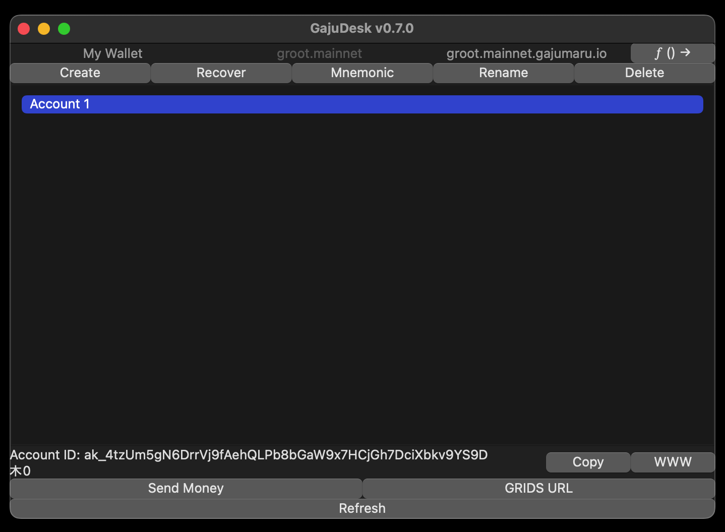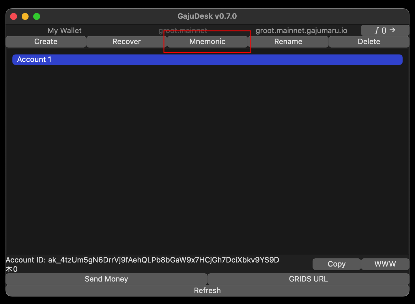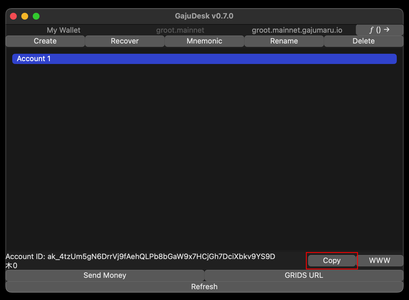 Look at the main screen of the wallet, GajuDesk, and find the "Copy" button in the lower right (next to the account