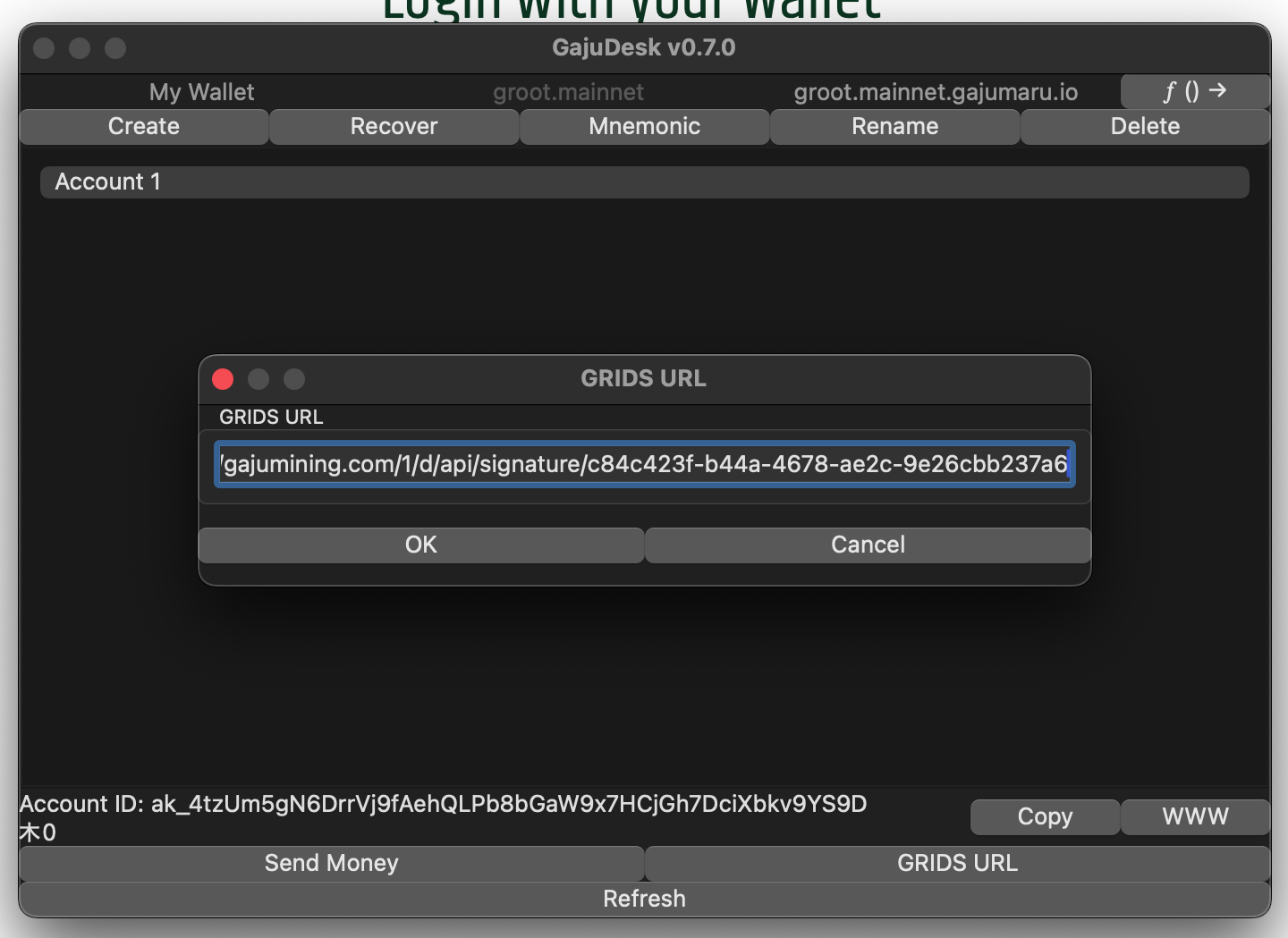 Paste the account ID you copied from your GajuDesk wallet into this field and click "OK"