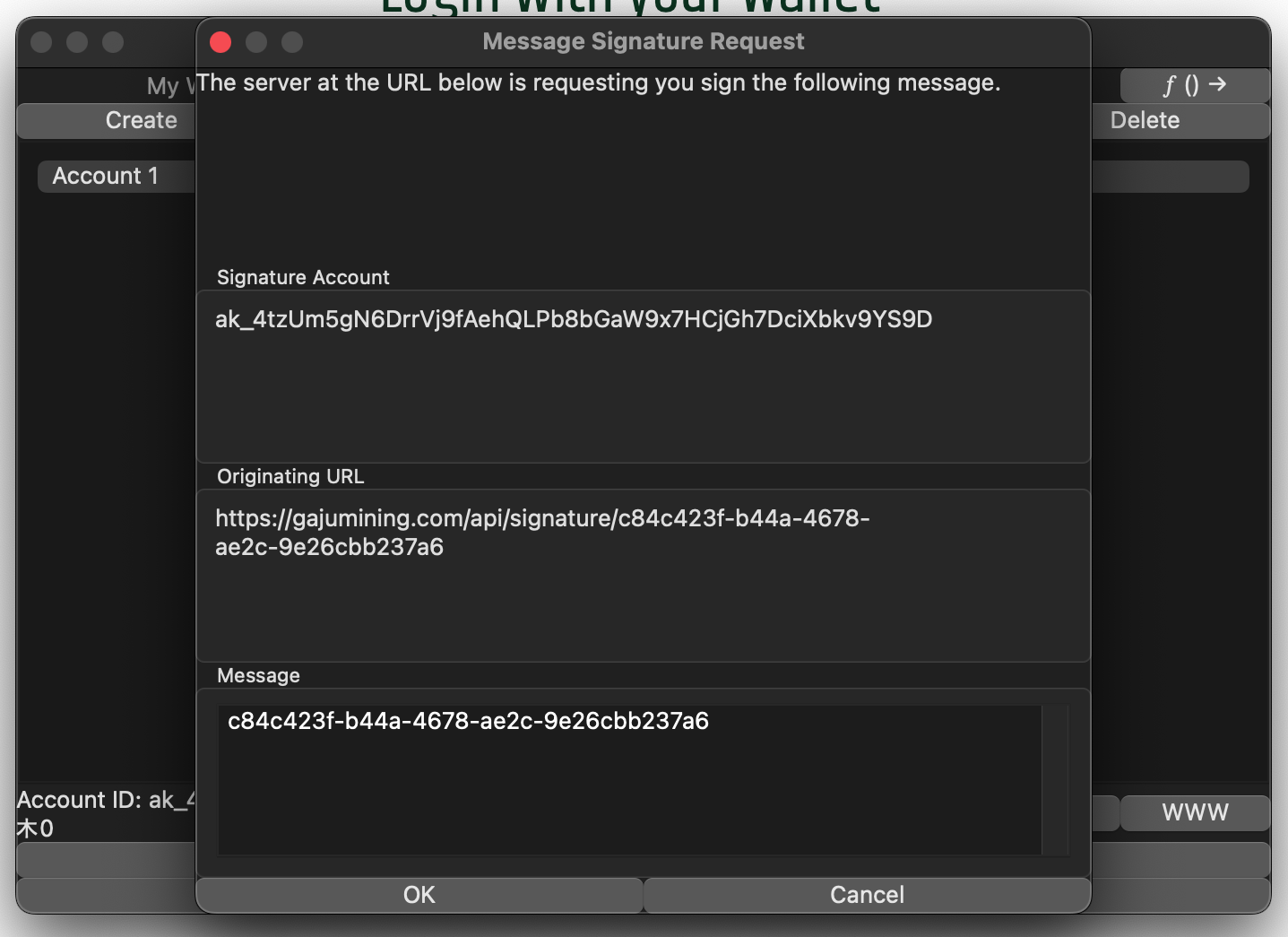 Click "OK" to sign the message with your account key and submit it to the site.