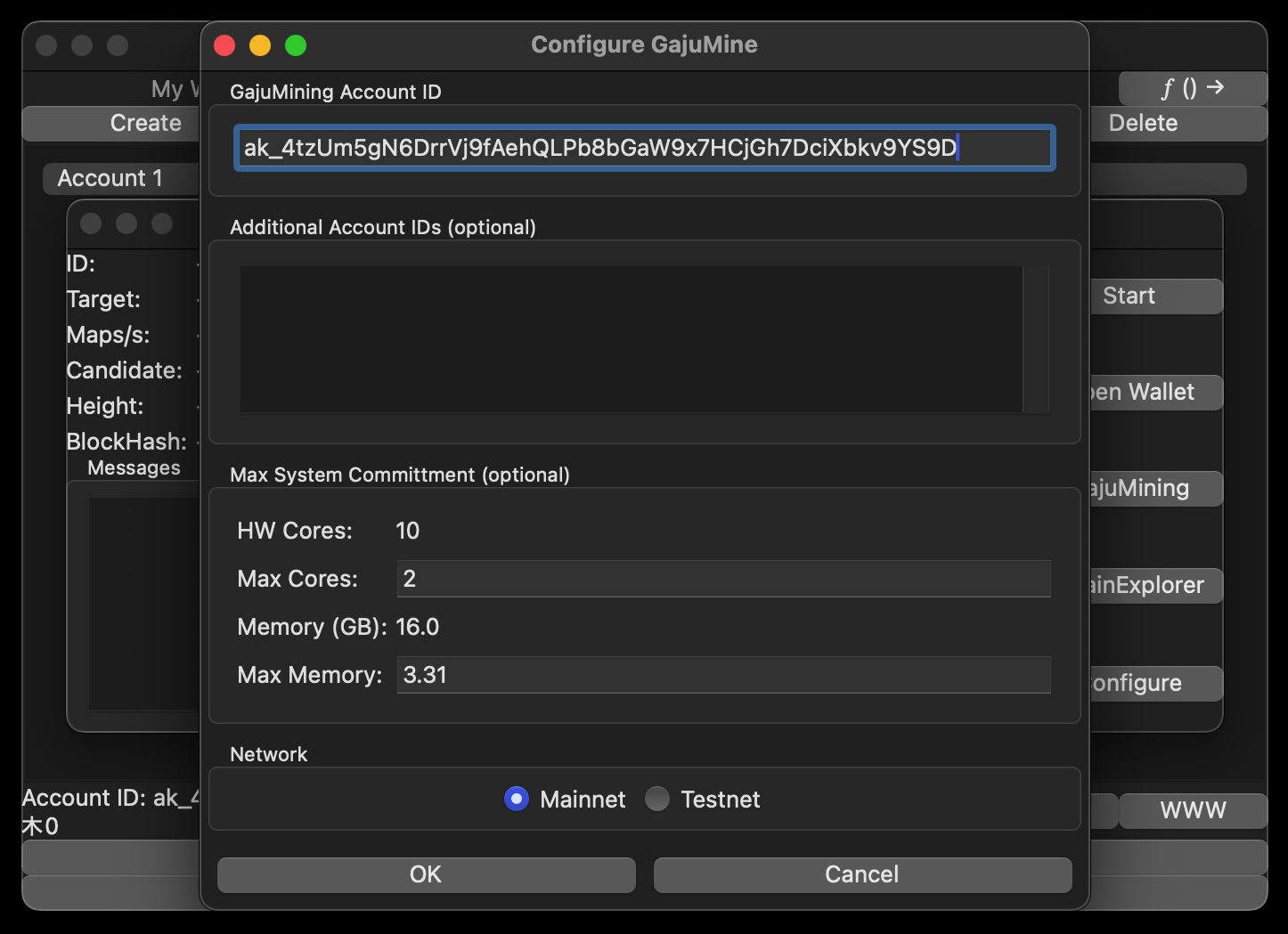 Your freshly created Gajumaru account ID is now registered with the hive leader, GajuMine is configured with your account ID, and GajuMine is all set to go.